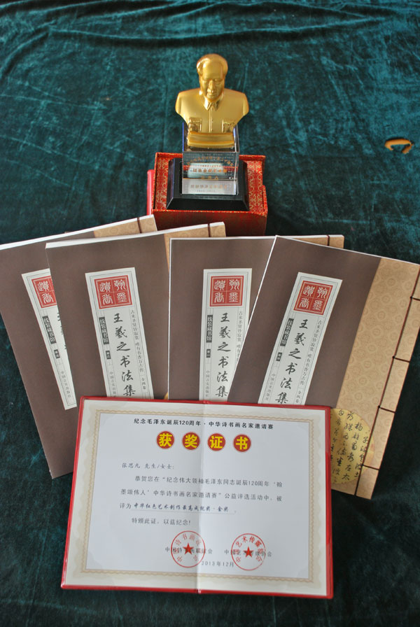 今年张老在传喜讯,去年底在由中华诗书画联谊会、中国艺术传媒协会主办的“纪念伟大领袖毛泽东同志诞辰120周年‘翰墨颂伟人’中华诗书画名家邀请赛”中思九先生的毛泽东同志剪纸照《慈祥的微笑》被评为中华红色艺术创作最高成就奖·金奖,并获得奖品毛泽东半身塑像一樽、王羲之书法集全套(四册)。