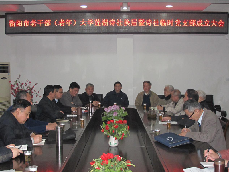 3月30日上午9时,衡阳市老干部(老年)大学二楼会议室里春意盎然。学校的莲湖诗社换届选举暨诗社临时党支部成立大会在这里召开。