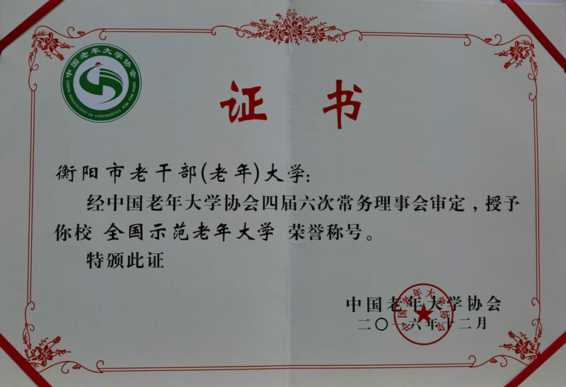去年年底,我们喜迎两件大事。一是国务院办公厅颁布全国《老年教育发展规划(2016-2020年)》。这是党中央、国务院关于老年教育颁发的第一个全面、系统、纲领性的文件,在积极应对老龄化的战略部署下、在全面建成小康社会的决胜阶段,《规划》是有里程碑式的意义,是我们广大老年教育工作者的重要指南和强大动力。二是中国老年大学协会评选"全国示范老年大学”。衡阳市老干部(老年)大学顺利通过推选评审,获得此项殊荣。