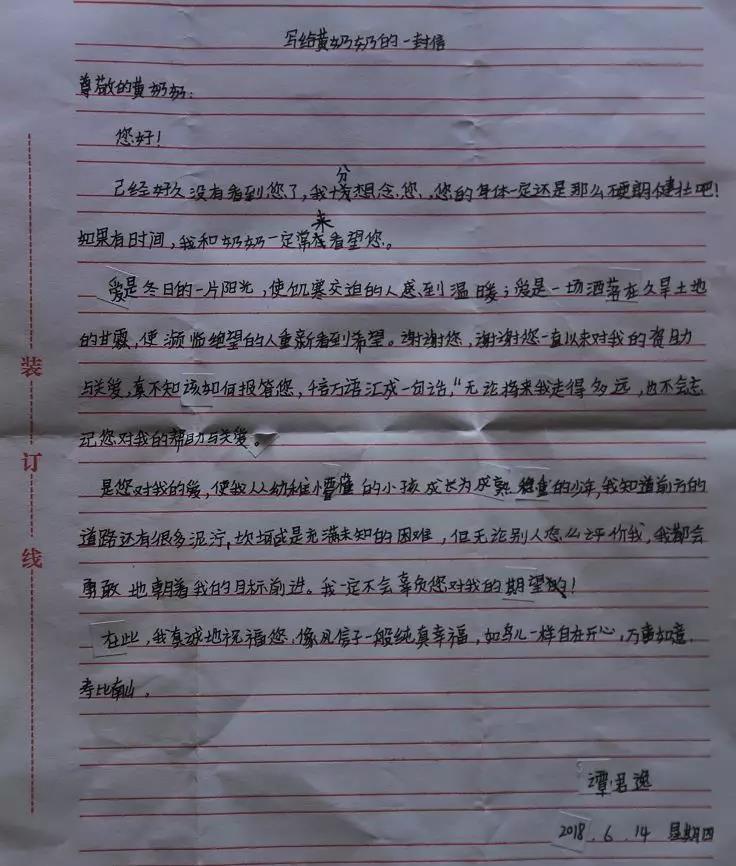 在夕阳红老年公寓,黄厚瑜卧室的抽屉里,珍藏的全是她曾资助过的孩子们给她写的感谢信。一个名叫李江的孩子在信中写道:“读大学期间,您一直都默默给我提供生活上的支持,同时给了我很多精神上的鼓励。” “在您的教诲下,我学习之余还参加一些敬老院的活动,用自己的行动传播正能量,带动身边人,关注社会,回馈社会。”