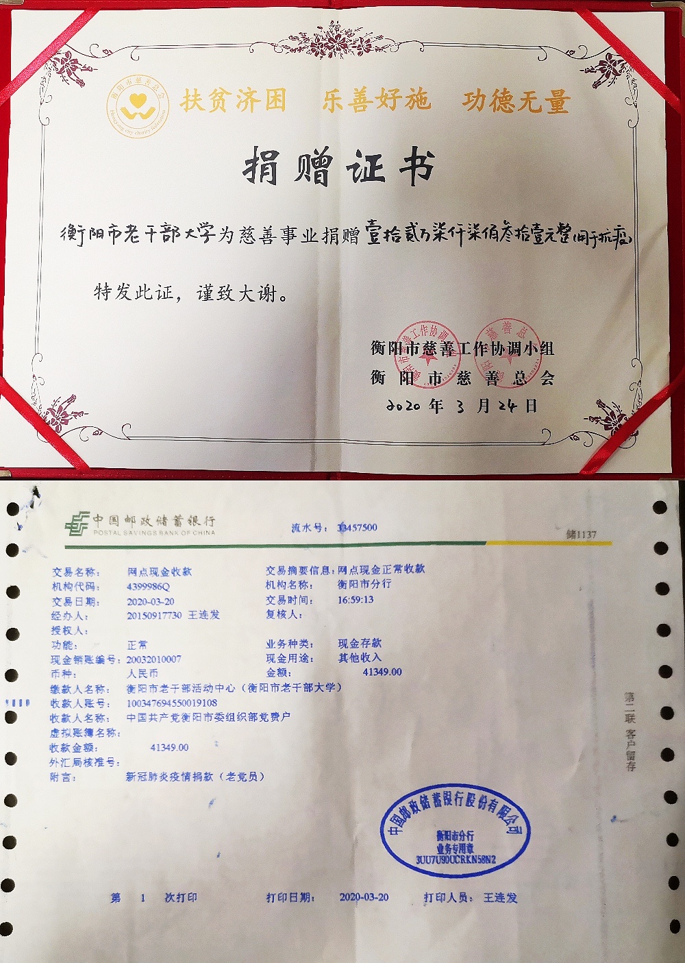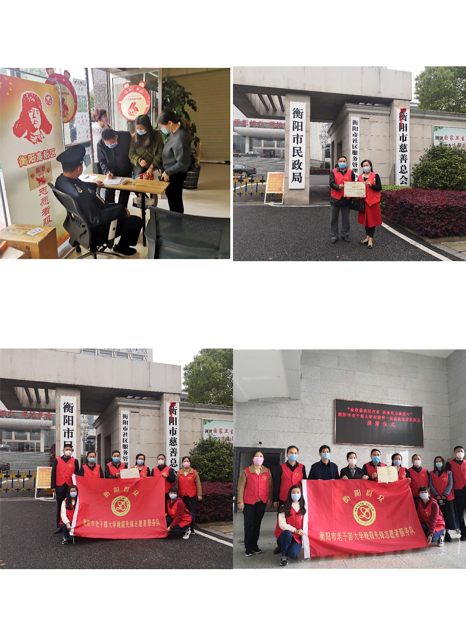 3月23日,衡阳市老干部大学晚霞先锋志愿者服务队一行10人,受2082名“衡阳群众”晚霞先锋志愿者委托,现场报交给衡阳市慈善总会抗“疫”善款12.7731万元。市民政局党委书记、局长、慈善总会常务副会长周小风主持受捐仪式,对饱含全校老领导、老同志和教职员工战“疫”必胜信念、支持最美逆行者的浓情大爱给予了高度评价和衷心感谢。