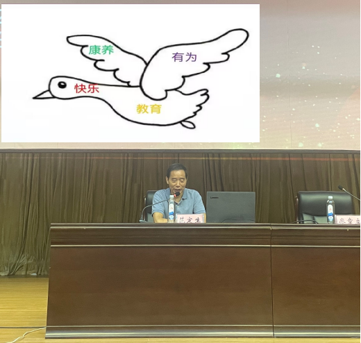 市老干部大学校长范定生以大雁为例,将大雁分割为头、身、左右翅膀,分别对应“快乐”“教育”“康养”“有为”八字校训,融合衡阳本土文化,形象生动的解读了校训的意义,对如何践行校训做出了具体要求。