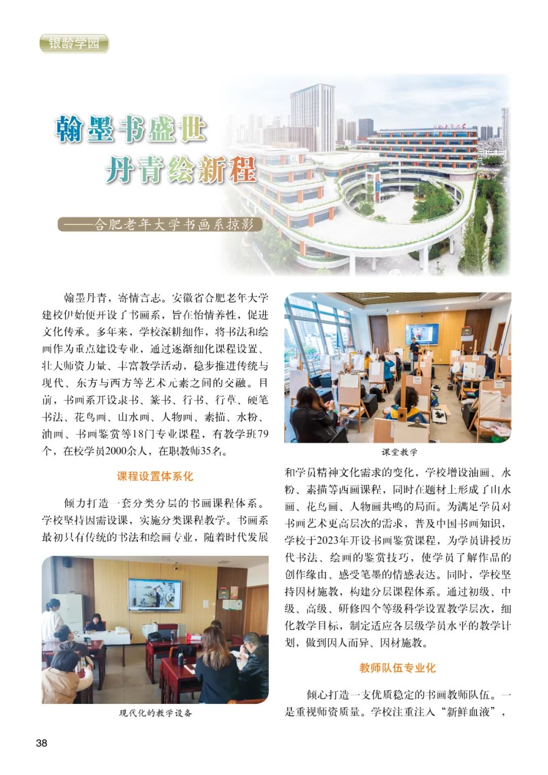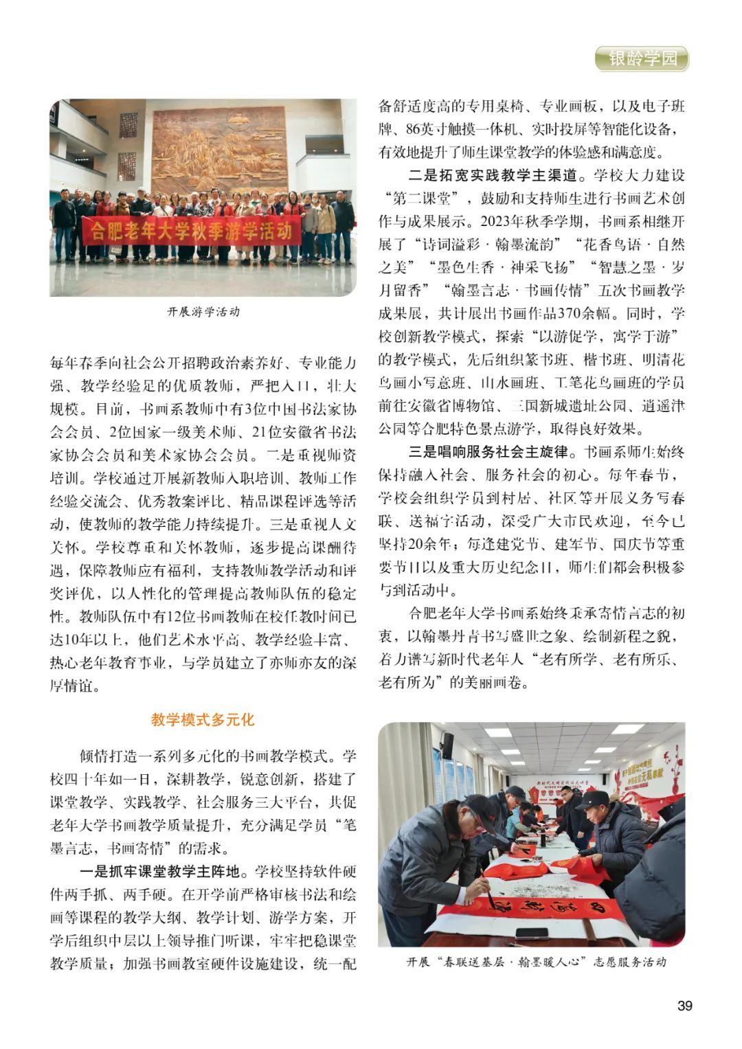 倾情打造一系列多元化的书画教学模式。学校四十年如一日,深耕教学,锐意创新,搭建了课堂教学、实践教学、社会服务三大平台,共促老年大学书画教学质量提升,充分满足学员“笔墨言志,书画寄情”的需求。一是抓牢课堂教学主阵地。学校坚持软件硬件两手抓、两手硬。在开学前严格审核书法和绘画等课程的教学大纲、教学计划、游学方案,开学后组织中层以上领导推门听课,牢牢把稳课堂教学质量;加强书画教室硬件设施建设,统一配备舒适度高的专用桌椅、专业画板,以及电子班牌、86英寸触摸一体机、实时投屏等智能化设备,有效地提升了师生课堂教学的体验感和满意度。二是拓宽实践教学主渠道。学校大力建设“第二课堂”,鼓励和支持师生进行书画艺术创作与成果展示。2023年秋季学期,书画系相继开展了“诗词溢彩·翰墨流韵”“花香鸟语·自然之美”“墨色生香·神采飞扬”“智慧之墨·岁月留香”“翰墨言志·书画传情”五次书画教学成果展,共计展出书画作品370余幅。同时,学校创新教学模式,探索“以游促学,寓学于游”的教学模式,先后组织篆书班、楷书班、明清花鸟画小写意班、山水画班、工笔花鸟画班的学员前往安徽省博物馆、三国新城遗址公园、逍遥津公园等合肥特色景点游学,取得良好效果。三是唱响服务社会主旋律。书画系师生始终保持融入社会、服务社会的初心。每年春节,学校会组织学员到村居、社区等开展义务写春联、送福字活动,深受广大市民欢迎,至今已坚持20余年;每逢建党节、建军节、国庆节等重要节日以及重大历史纪念日,师生们都会积极参与到活动中。