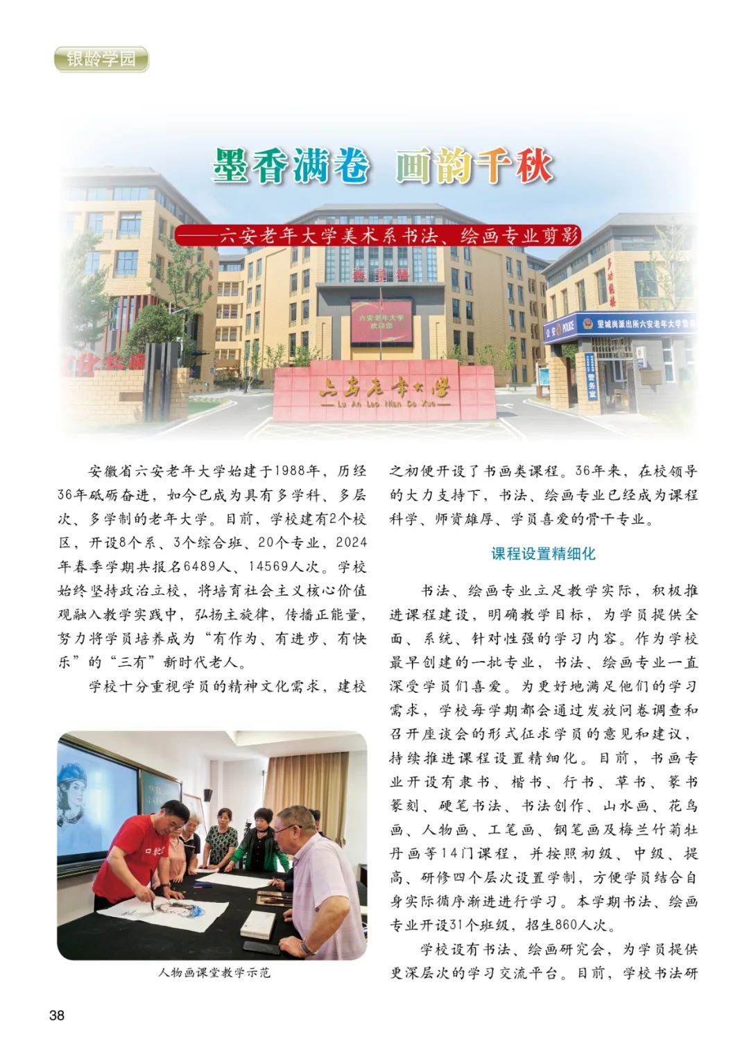 安徽省六安老年大学始建于1988年,历经36年砥砺奋进,如今已成为具有多学科、多层次、多学制的老年大学。目前,学校建有2个校区,开设8个系、3个综合班、20个专业,2024年春季学期共报名6489人、14569人次。学校始终坚持政治立校,将培育社会主义核心价值观融入教学实践中,弘扬主旋律,传播正能量,努力将学员培养成为“有作为、有进步、有快乐”的“三有”新时代老人。