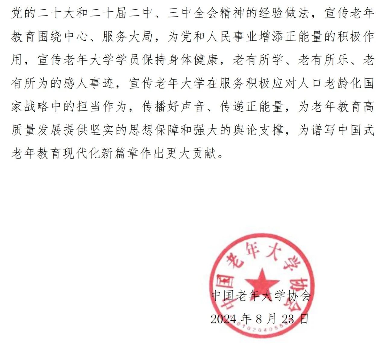 近日,中国老年大学协会印发《关于表扬全国老年大学宣传工作取得优异成绩的通报》,衡阳市老干部(老年)大学被评为全国老年大学宣传工作优异成绩单位(全国155所,我省共5所受表扬)。